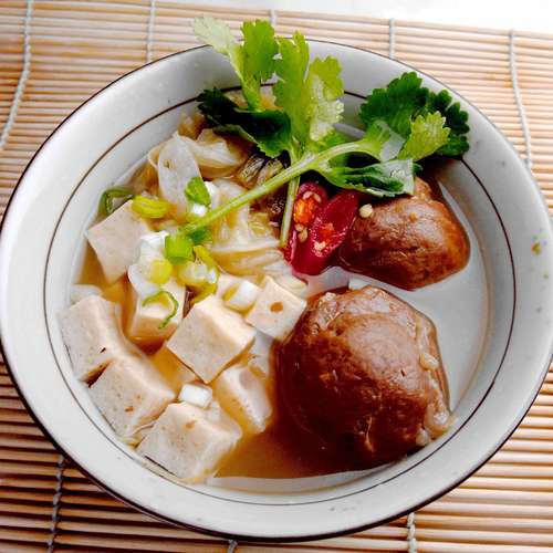 中式家常菜:貢丸,白菜,燒豆腐。
