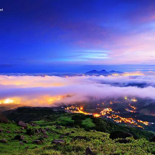 山景、燈火、雲海、晚霞