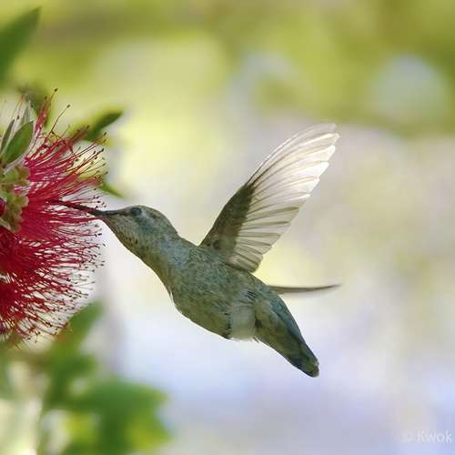 晨光 - 深紅色的瓶刷花和 Anna's 蜂鳥