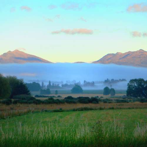 曙光、晨霧、草林