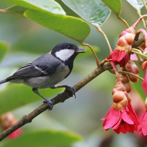 紅花下的八哥鳥