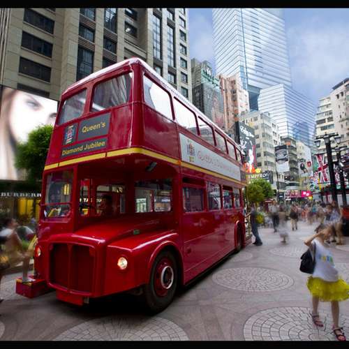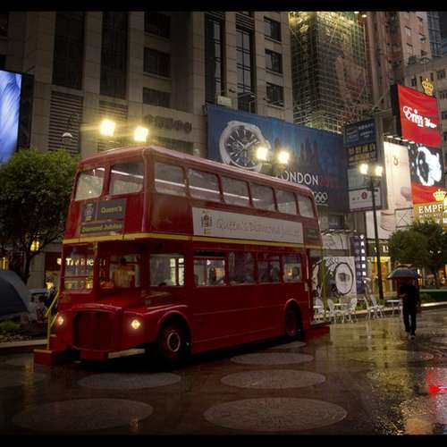 香港雨夜中的英國巴士