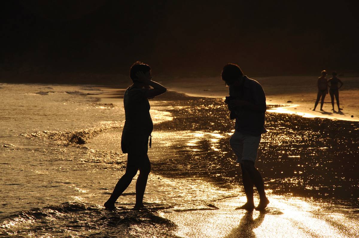 在沙滩上,看到一位丈夫在金黄色的夕陽下替懷孕的妻子拍照,忍不住拍下这情境。