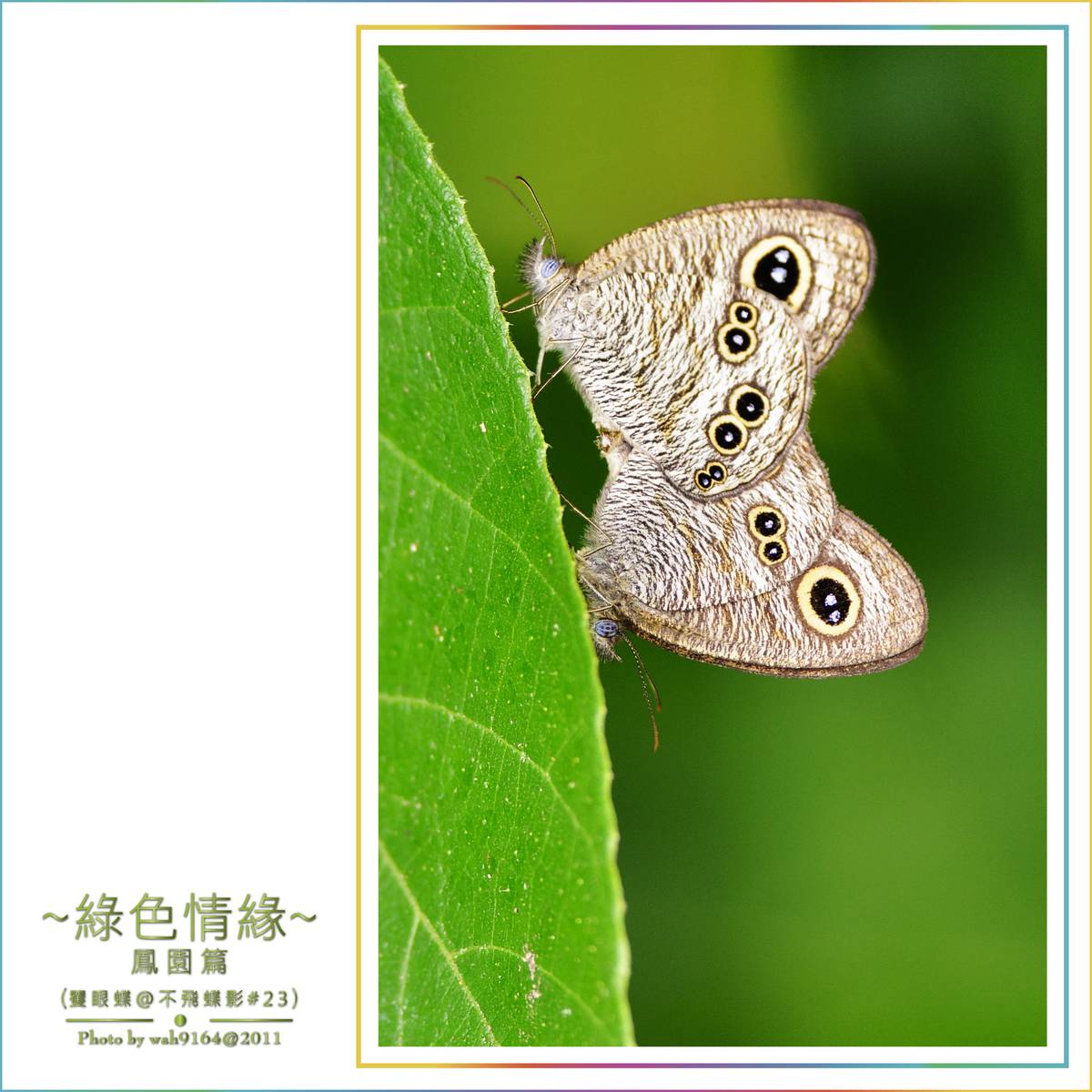 琴日有一天假期,再到鳳園打個轉,今個月已經係第三次到園內影相,人小小但蝴蝶都好多,又再決死好彩第三次影到"矍眼蝶"交尾,回到屋企在看今次影的全部相,有好多(炒晒),只得幾張係清色啲及可分享的,真係可惜,自己學藝未精所至. 只求 "開心影相" "開心分享" "開心睇相" ~~ 謝謝師兄師姐們 "點閱" "鼓勵" "指教" ~~ 謝謝 ~