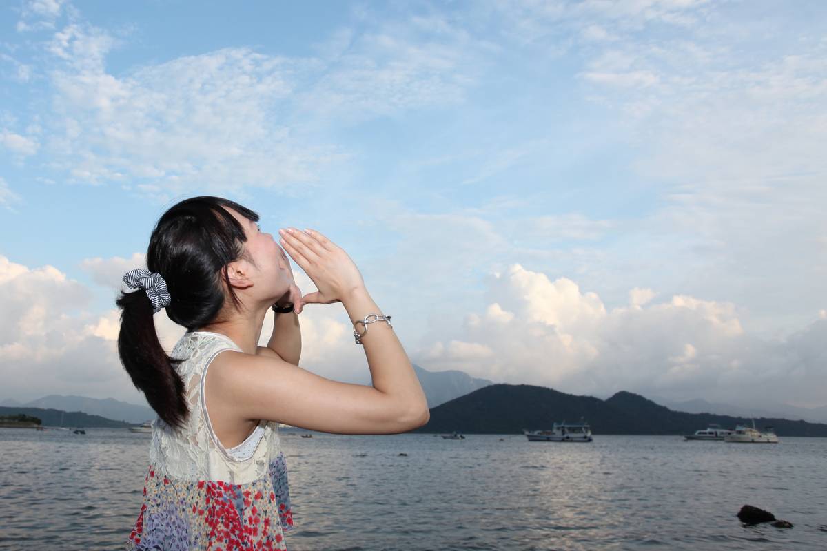 在一個晴朗的下午, 經過一個海灘, 看見一個美女向蔚藍的天空開心地不停地呼叫, 不知道她有什麼開心事情發生 !