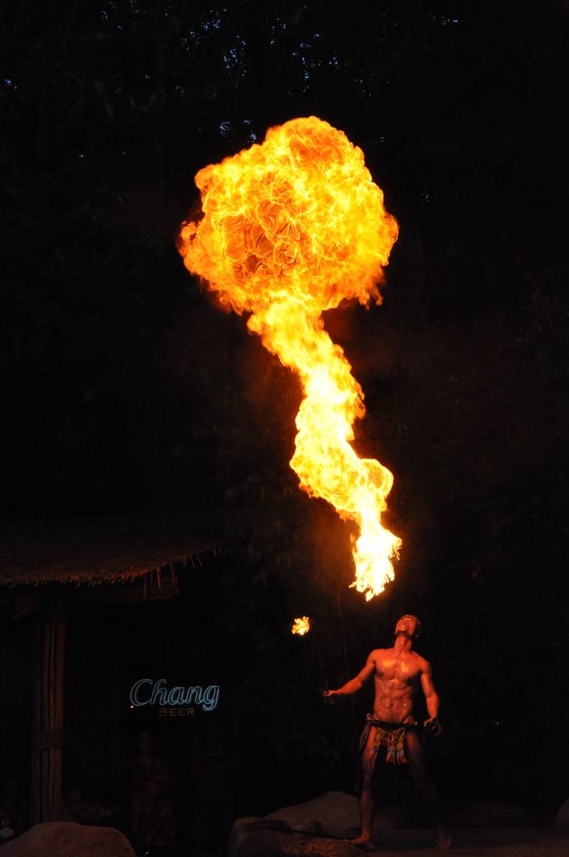 在大自然的環境下, 表演者穿著原始的服裝,噴出巨大的火焰, 在漆黑中帶出光芒,彷彿他黑暗中運用自己的力量照亮大地,實在令人嘆為觀止!