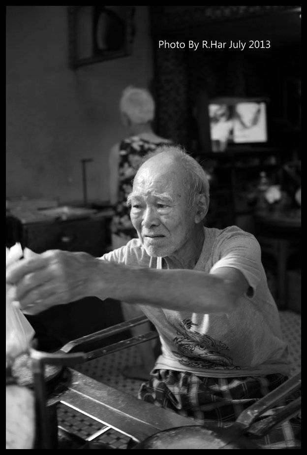 看到倆老白髪蒼老、簡樸衣著、吃力造餅、一坐一站…