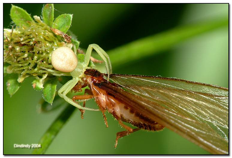 這個蜘蛛很厲害,專門躲藏在鬼針草的花瓣後,伺機撲殺被花蜜吸引而來的昆蟲。這一次收獲真好,比牠大五、六倍的獵物也得束手就擒!