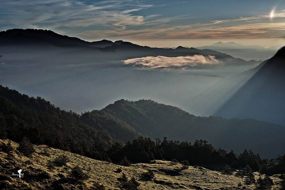 晨光從山隙間穿透而來,形成這獨特畫面。