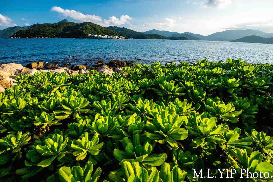 一片翠綠的草海桐, 使平淡石灘生機盎然.