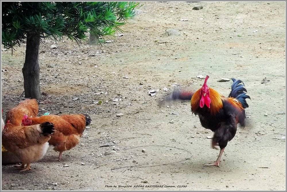 雄雞裝凶作勢飛撲而來, 宣示主權, 其實另一角落遊客們正在挑選靚雞佐膳, 愈靚愈快上枱 .