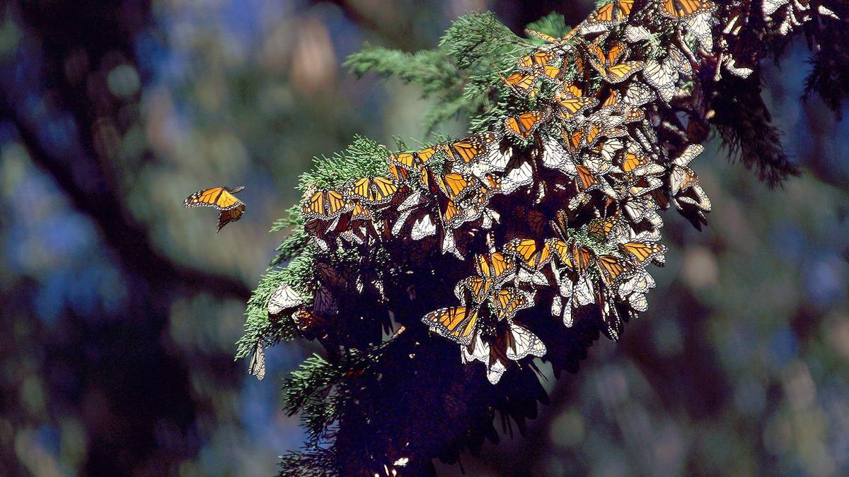 一群美洲虎斑蝶停留在加州沿海公園内,正在遷徏往墨西哥途中....