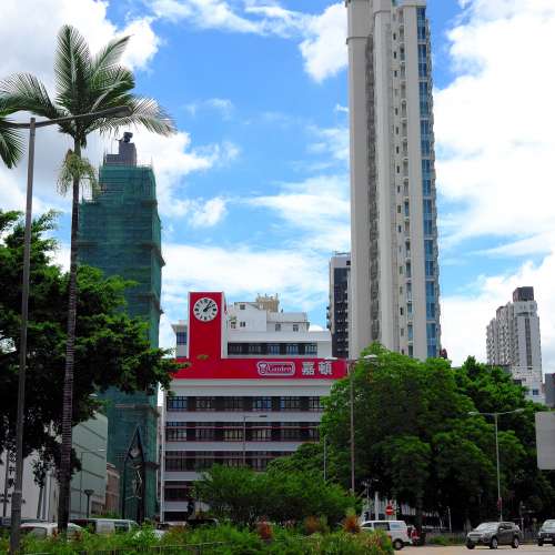 低角度欣賞木瓜樹,枝葉生長像光圈葉一樣平均整齊,葉影交疊下映出不同層次,可惜避唔開建築物,否則更完美。