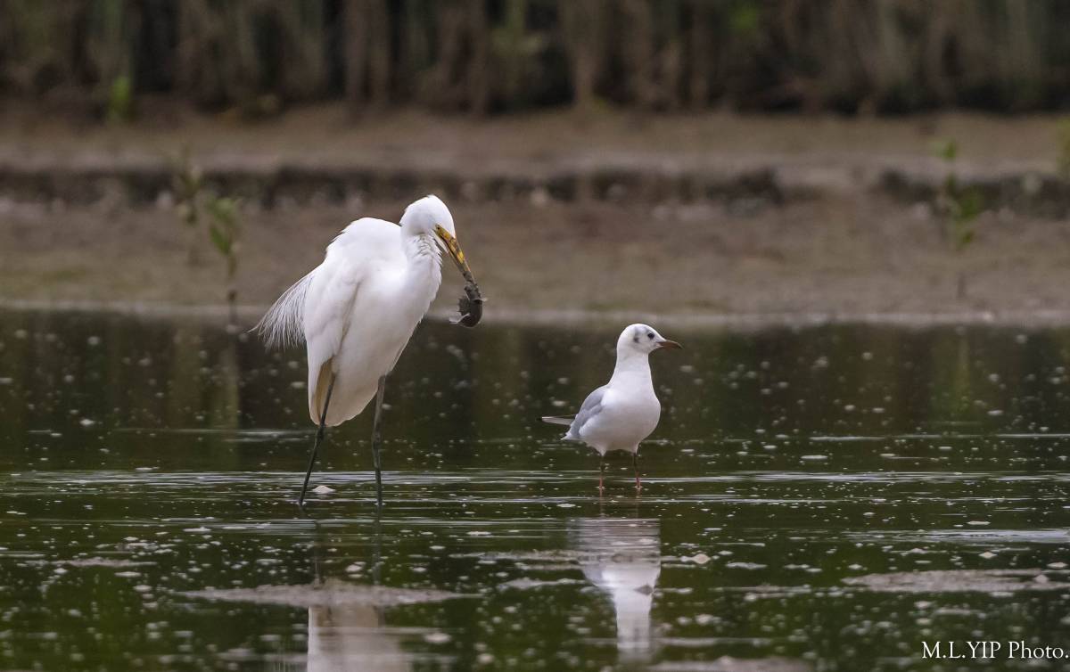 大白鷺捉到魚, 身旁正有一隻紅嘴鷗, 以為它會馬上飛搶, 不過奇怪地, 它竟不為所動喎. 多謝欣賞.