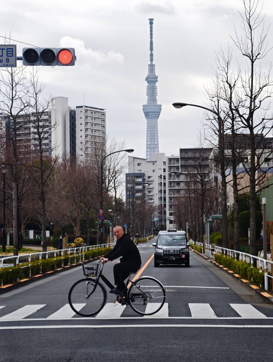 相片拍攝地點是日本荒川汐入,本來目的是去汐入公園影櫻花,可惜看不到,唯有街拍,影了這張東京晴空塔照片,巧合地有位怕怕騎著單車經!