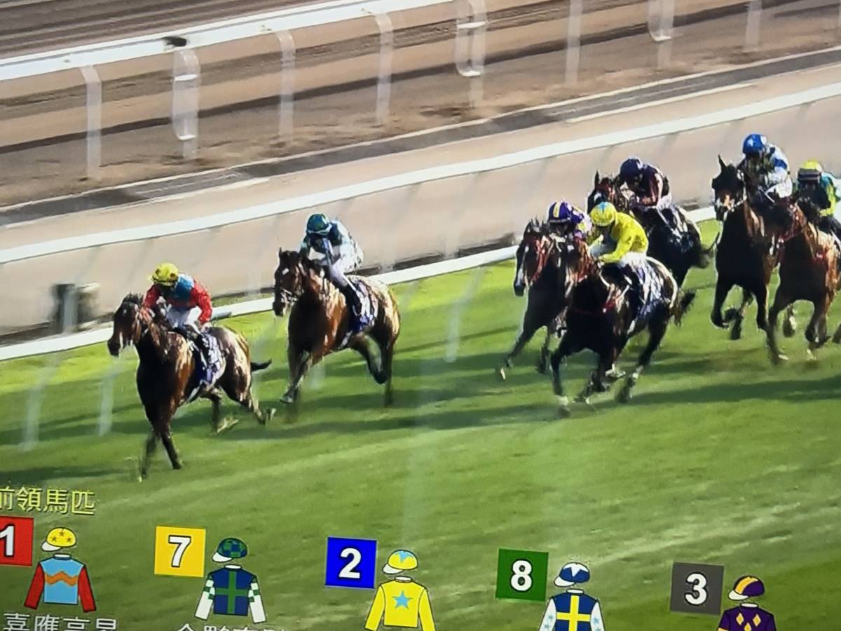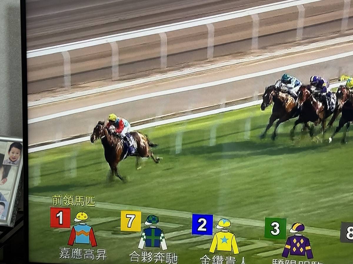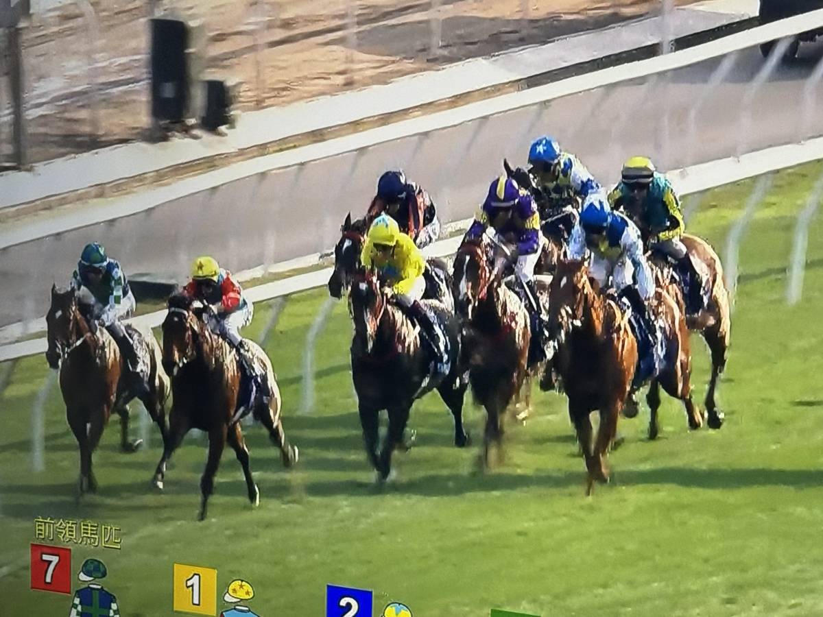 創造歷史當日,馬群轉入直路一剎那,剛好用手機拍下電視畫面。