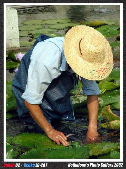 他正在清理荷花池....