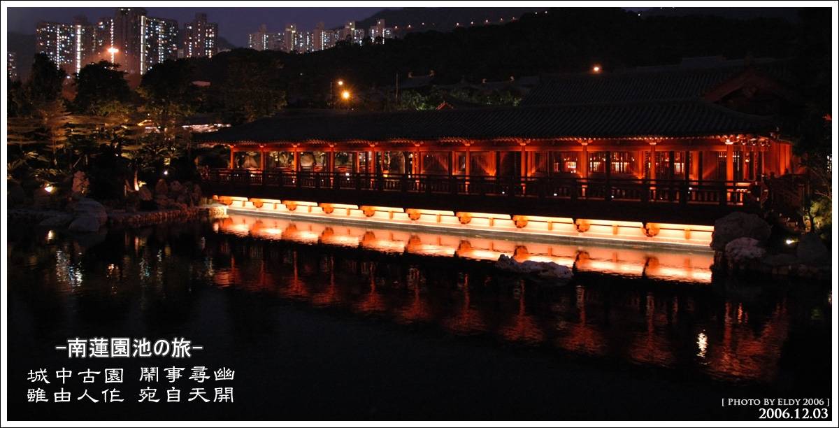 私今天3:00pm到達南蓮園池, 也是私第一次去, 很開心, 很興奮, 但走也一幅也拍不下手, 一來人多, 二來又不是很美, 於是決心等晚上才拍, 結果原來晚上真的和我所想那麼對, 那麼憩靜.