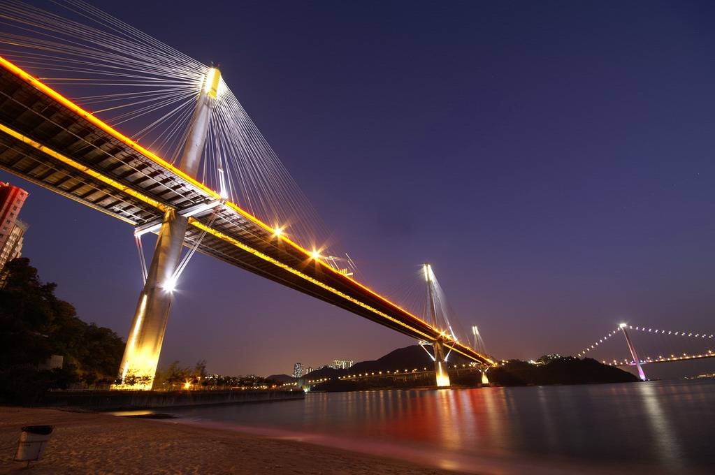 汀九橋照耀在海灣上令到海水染上紅紅的色彩真是很美