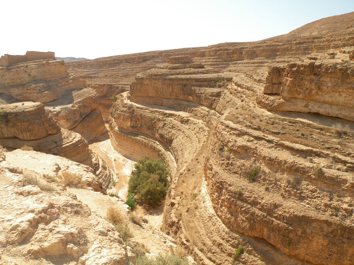 cactus, ruined villlage, oasis, dry river bed and desert