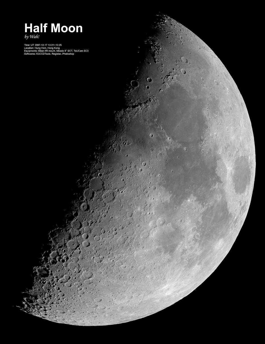 月亮的環形山, 在半月的時候最明顯, 最有立體感