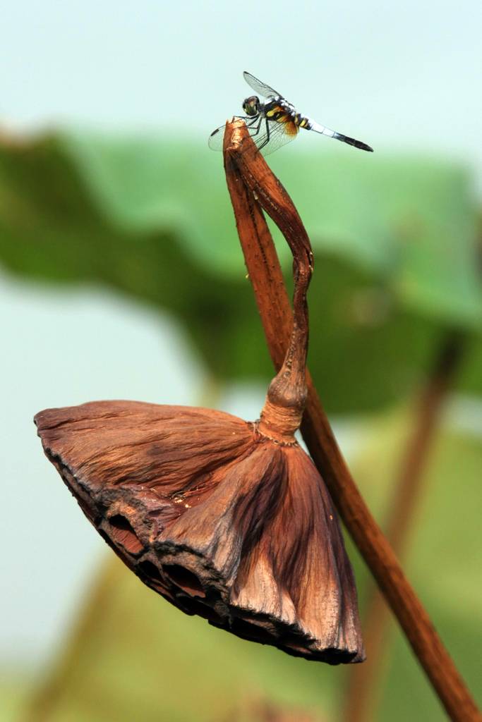 This dragonfly seemed to separate unwillingly from this dead lotus...so missing & blue! Thank you for click-in!
