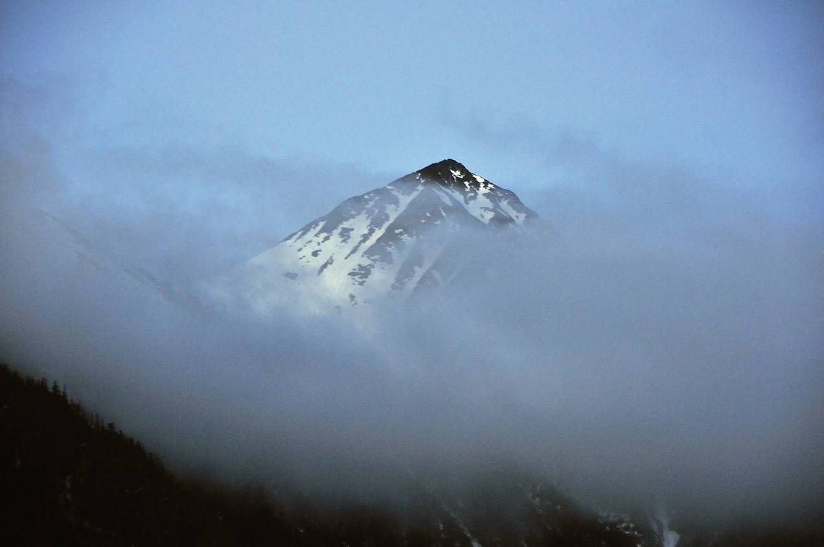 日出時份的雪山,在雲霞的半掩下,像是高不可攀一樣。