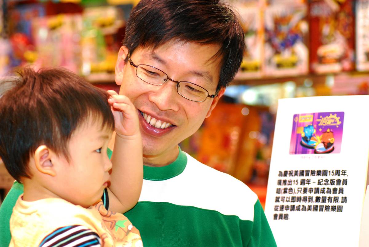 小朋友喜歡到冒險樂園遊玩, 他仿似對爸爸表示想要入會做會員, 而爸爸又很像心靈感應地報以徽笑的回應。