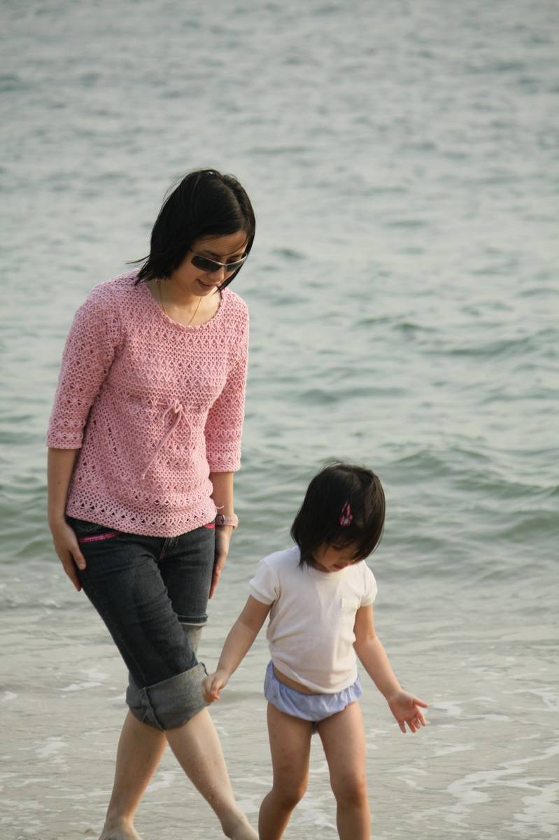 一家人去海灘玩,女女玩到濕晒,只剩下底褲仔,玩到累了,和媽媽在海邊散步,爸爸不經意地拍下這張照片。感覺很溫馨。