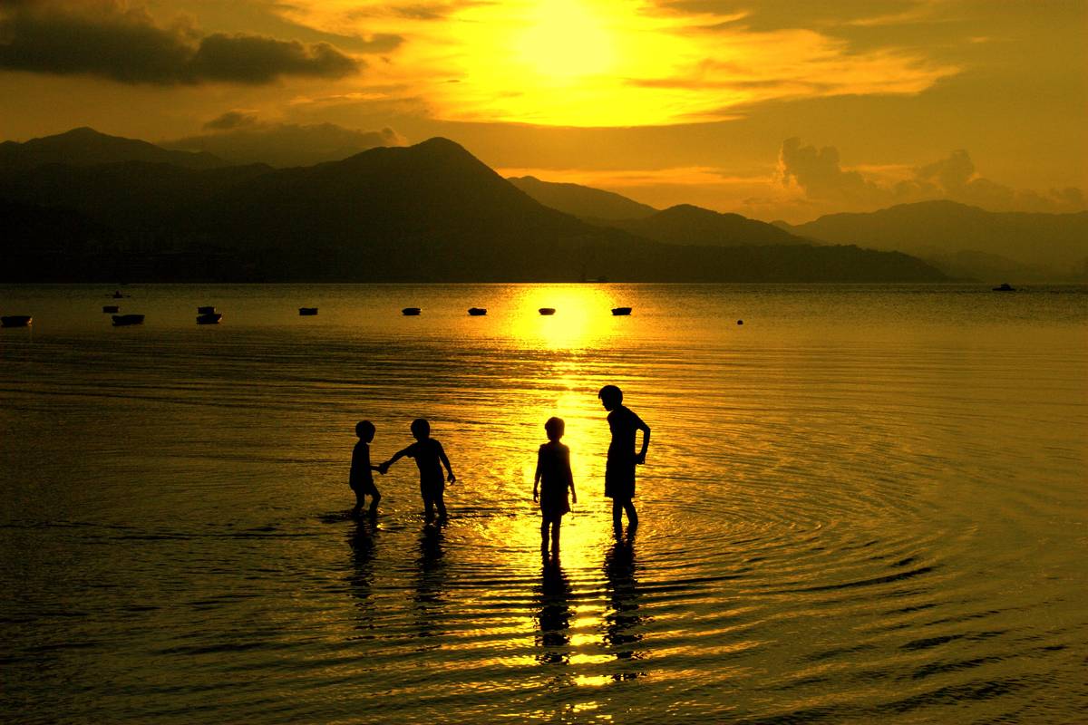 日落黃昏,小朋友到沙灘玩玩水,享受大自然一樂也。