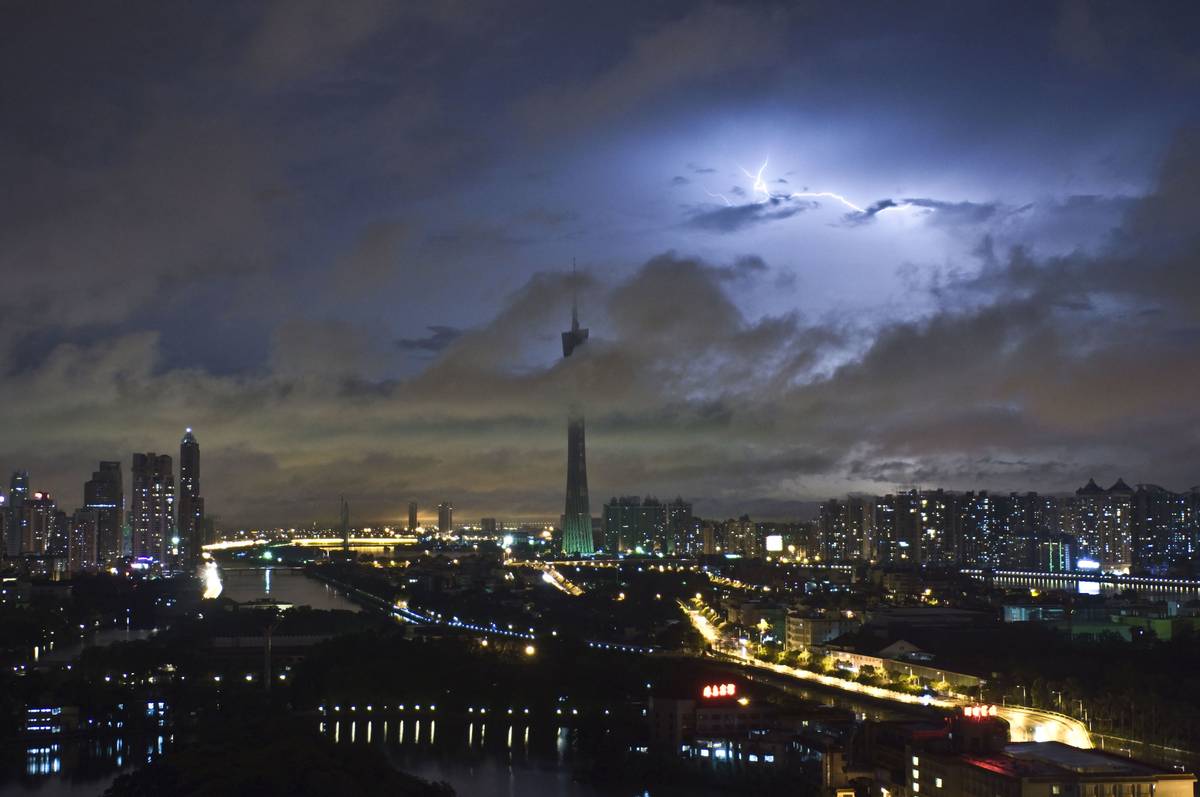 台风刚过,广州市区能见度高,试拍夜空雷电交加,请师兄们指教!