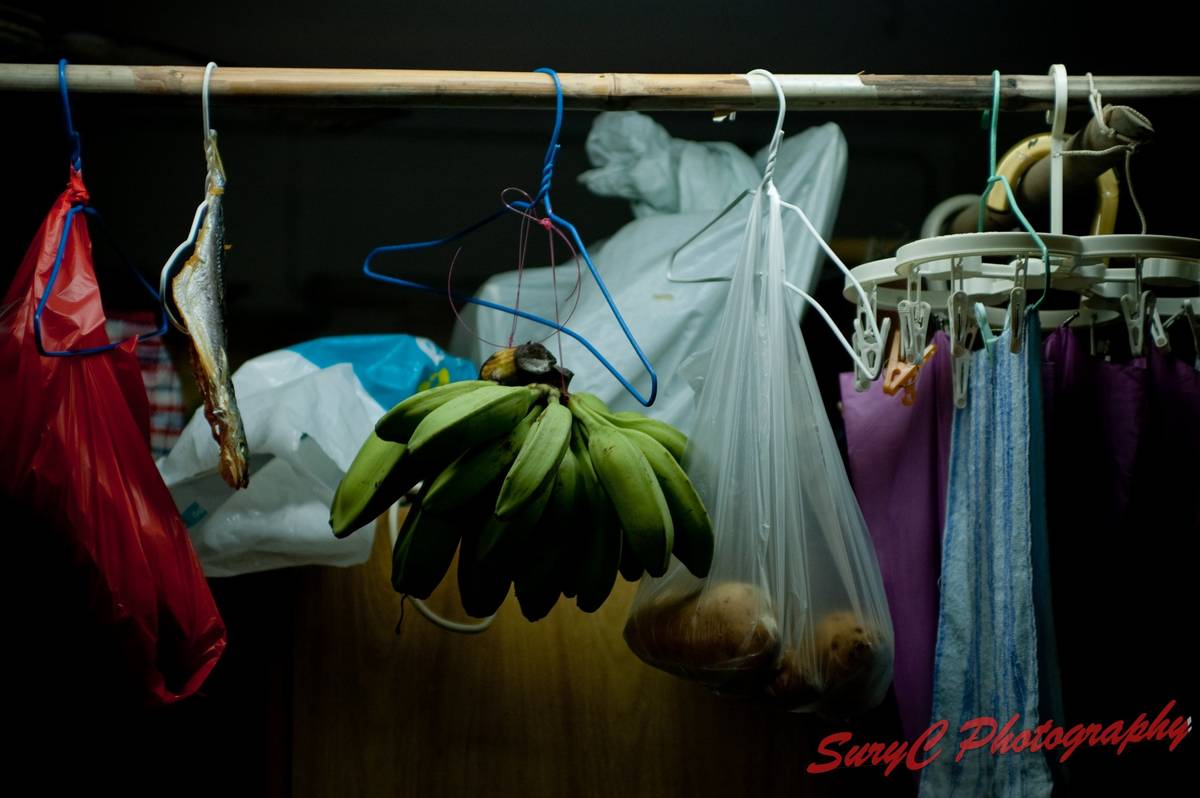 魚村居民一支竹枝就掛上香蕉,咸魚, 衫 等物品。好特別!