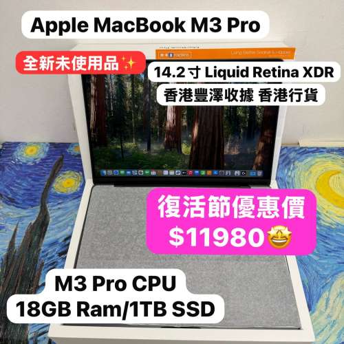 (復活節優惠🐣全新未使用品M3Pro🔥 )香港行貨豐澤收據Apple MacBook M3 Pro 2023 M3 Pro CPU/18GB Ram/1TB SSD/18核心GPU/Liquid Retina XDR Mon/14.2吋/黑色