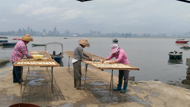 流浮山可以逛的地方不多,小道兩旁的店都是以出售海味及海鮮為主, 也有數家海鮮酒家, 可以買點海鮮給店裡弄來吃。蠔是這裡的特產, 隨處可見。走到路的盡頭是海邊, 看到有些工人在晾蠔, 而海的對岸是深圳市, 聽說那邊按摩很便宜, 很想去啊~~