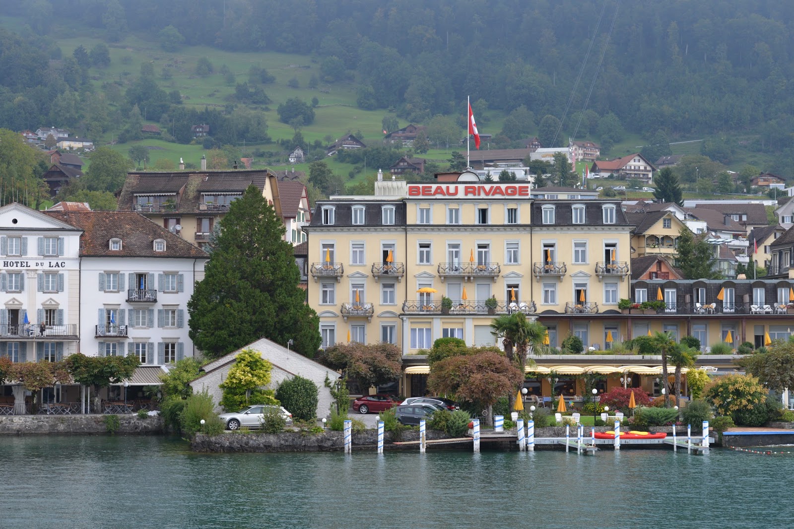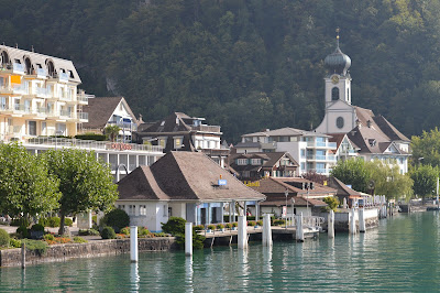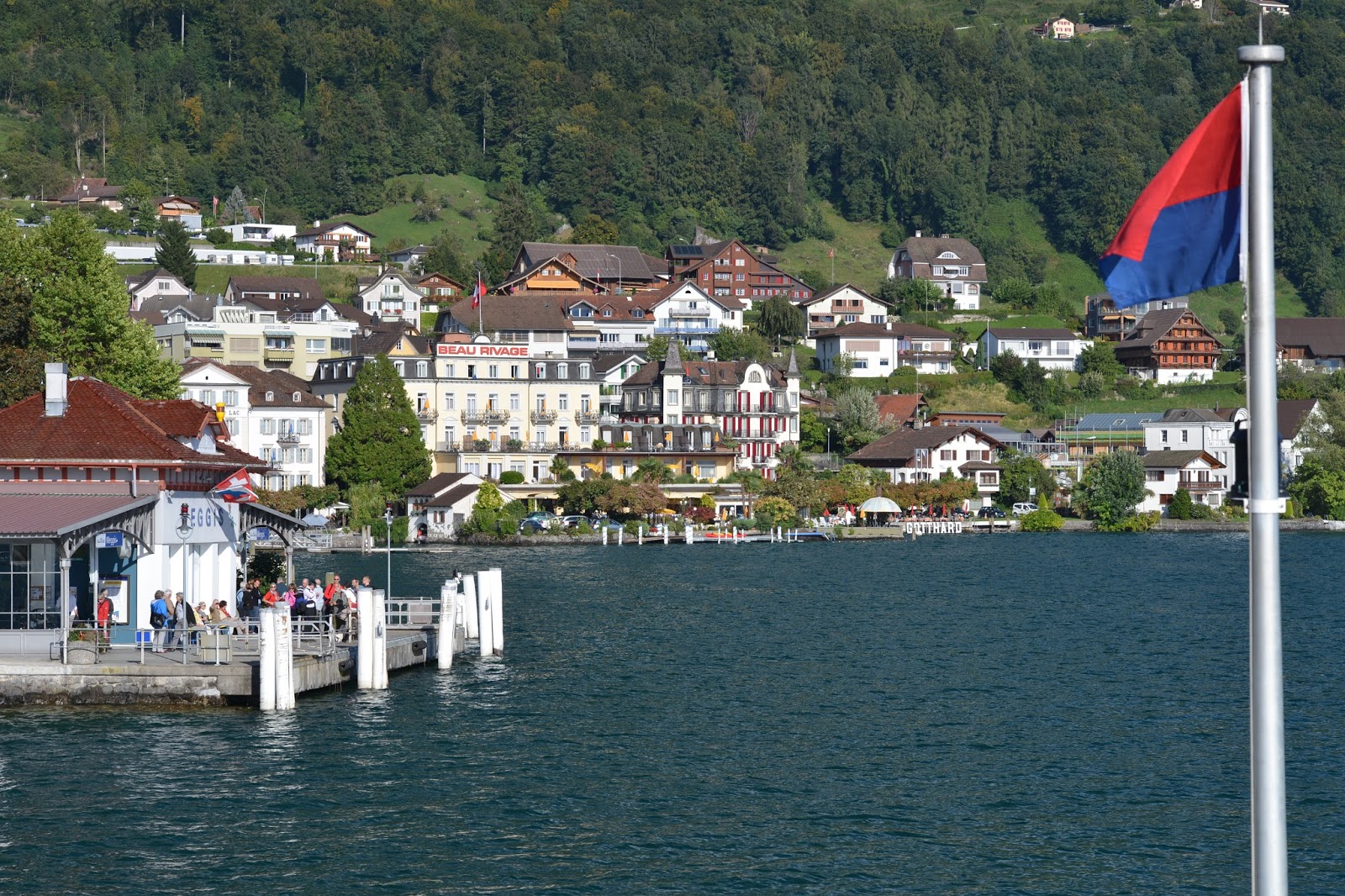 持有瑞士火車証可免費乘坐琉森的渡輪. 我們在琉森火車站對面的琉森湖碼頭先看渡輪時間表, 然後乘坐渡輪遊湖. 我們在渡輪上,看着渡輪經過幾個碼頭. 包括Treib, Vitznau, Beckenried and Weggis. 碼頭沿岸的酒店都非常美麗.