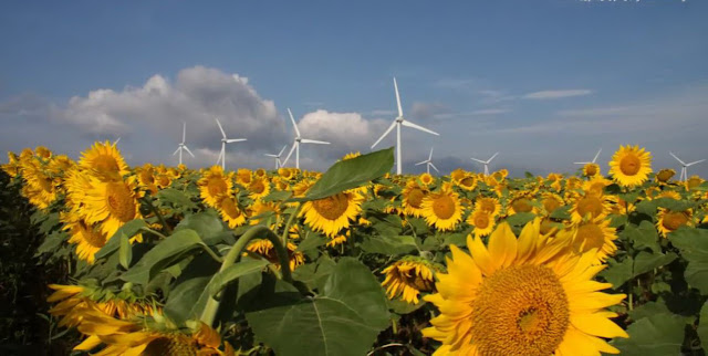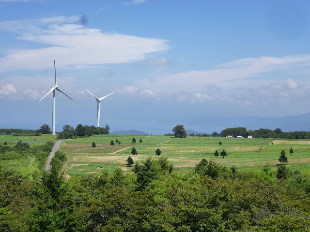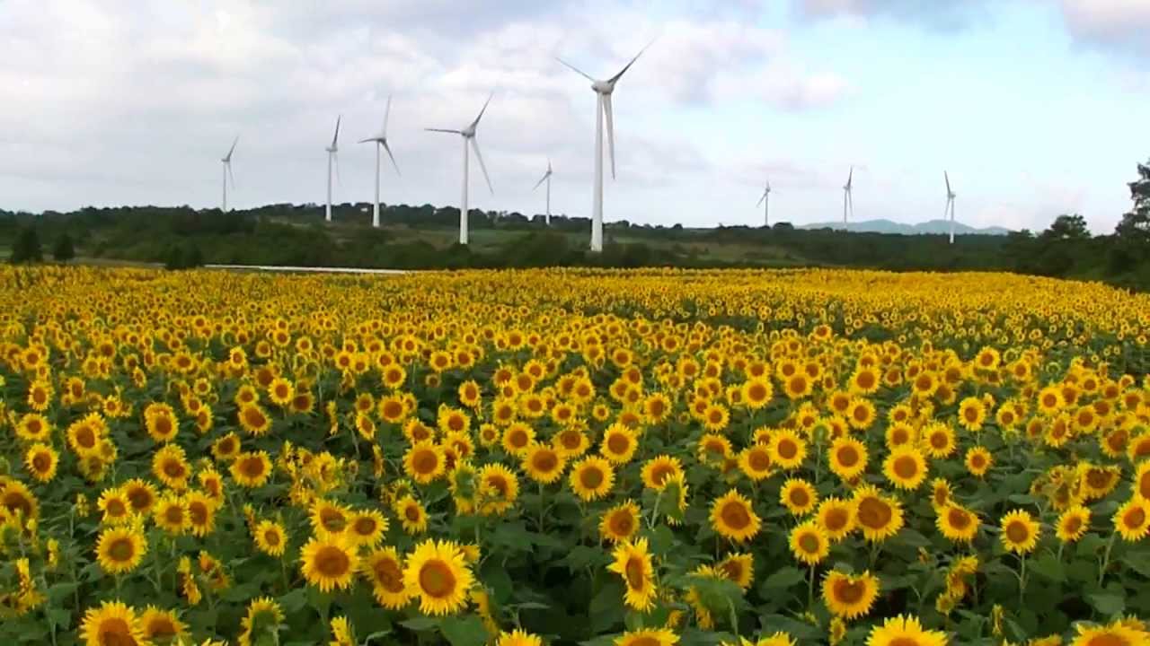 "在高原上並排著33座風力發電用的風車。該高原就位於會津布引山的山頂。8月上旬~9月上旬,在高原上可以看到遼闊的向日葵地。向日葵是分三期種植,所以可以長時間享受向日葵地樂趣。