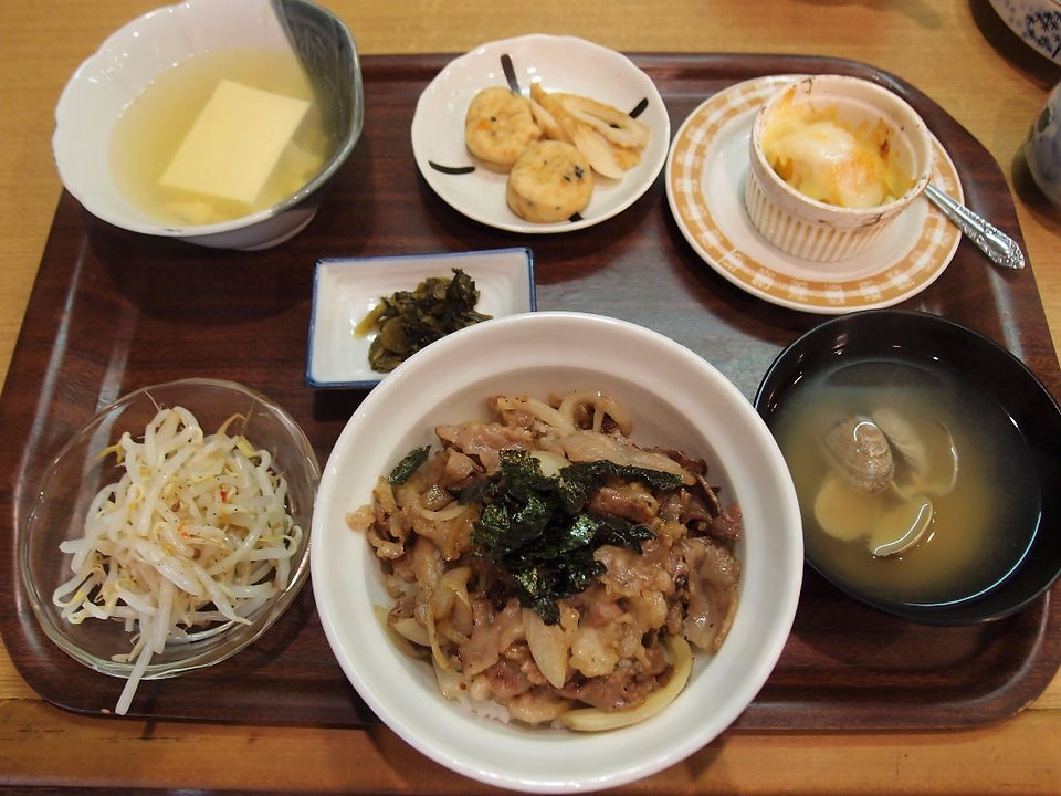定食來了,嘩!1300日元來說也太豐富了吧。有前葉、醃菜、燒牛肉飯、魚餅、蛋、芝士焗南瓜,很不錯呢。