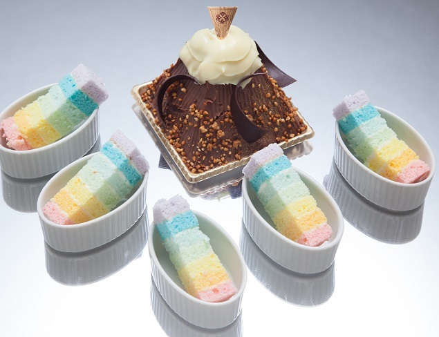 七層の色鮮やかなレインボーケーキをチョコレートでコーティングし山をかたどったケーキに仕上げました。食べるのがもったいなくなってしまいそうな可愛らしい期間限定デザートです。