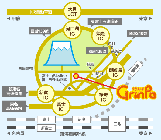 下東名高速道路御殿場IC後,行經富士山Skyline或南外周道(大野原)約30分鐘車程