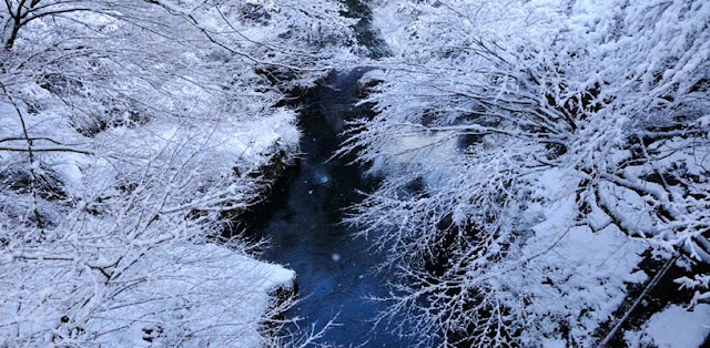 山中溫泉降雪量很大。11月到2月之間,雪染白了溪谷的樹木,溫泉蒸氣包圍著街道,山谷流淌的水流聲也消失在寂靜中,景色顯得格外夢幻。