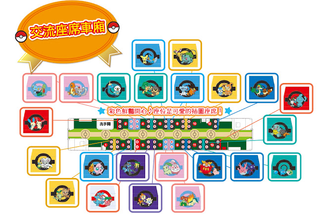 座椅的靠背全部採用色彩鮮艷的Pokémon設計,窗簾及天花板部分也有Pokémon的影像。