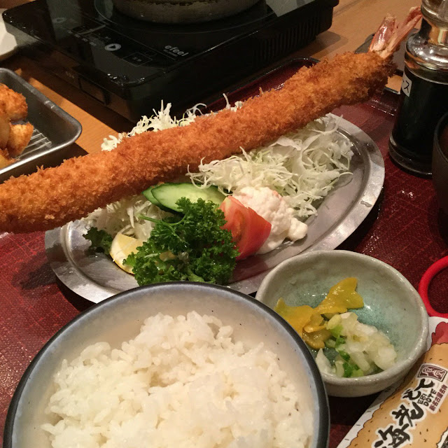 超長珍寶炸蝦,配上沙律,漬物,湯,加上雞蛋蛋黃醬,非常有特色