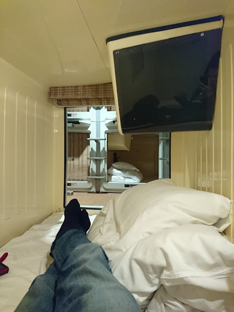 電視機headphone布簾燈光支裝水等等全部有齊,內部空間不是非常大,但不覺狹窄,一定舒服過港產劏房,逼逼地兩個人抱住訓都得………但溫馨提示你前後左右膠囊都係男人lai ga
