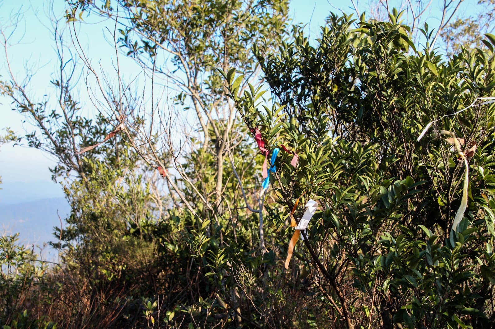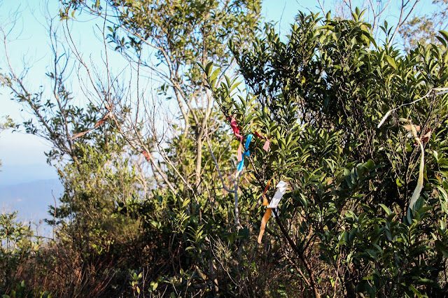 去到最高點(好似係~),又有幾個分岔口,當我們疑惑著去向,細心一點就會留意附近的草叢有點「特別」,你會發現其中有一堆草叢上掛著特別多絲帶,像是前人非常努力地想提醒大家「喂!呢度先係啱既路呀!!!」,既然有這麼多的溫馨提示,當然跟著提示而行~