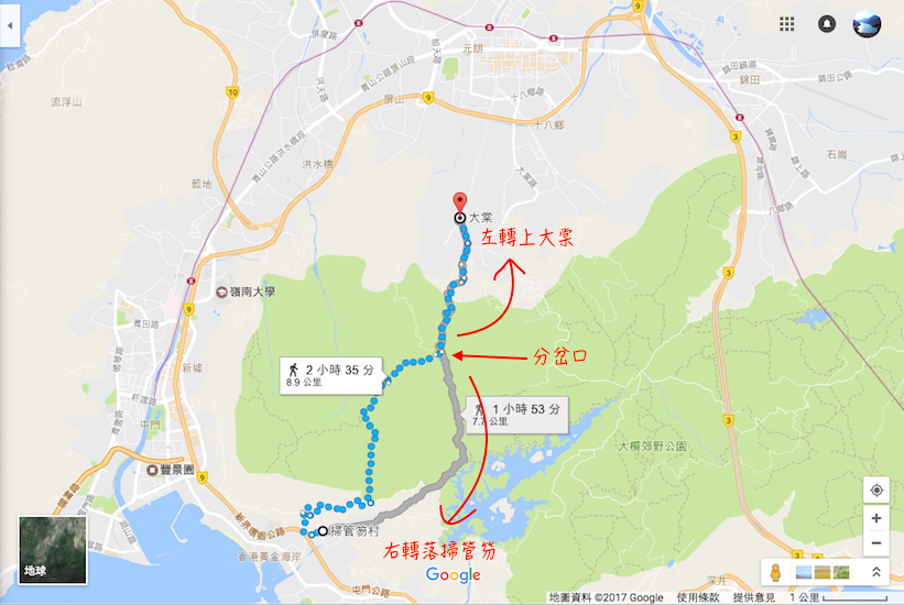 接下來我們決定往未知的方向走,不知道前方是否有路去元朗,但從地圖上見到方向是對的,所以本著「路是人行出來」的信念,走走看吧。