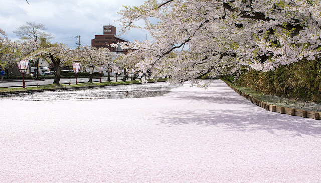 旁邊既護城河滿滿的櫻花散下形成華麗的櫻花河境