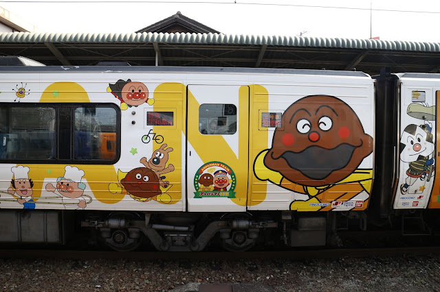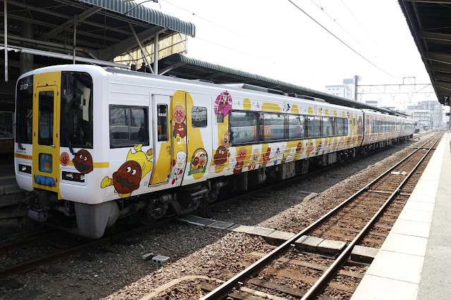 四國地區的麵包超人列車總共有21輛。圖片為行駛在予讃線的ドキンちゃん号(紅精靈號)。目前共有「予讃線」、「土讃線」「高徳線・徳島線」以及行駛在瀨戶大橋的麵包超人小火車等4個區間,幾乎遍布整著四國地區。