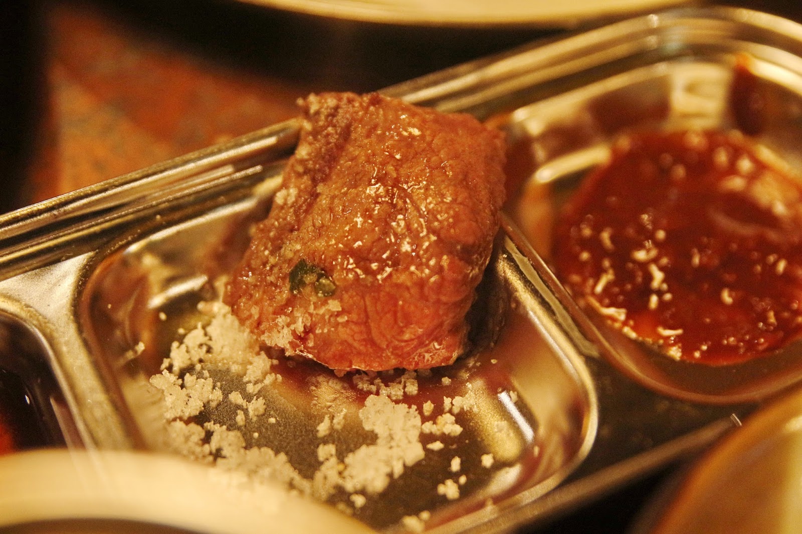 牛里肌均勻地分佈著油花,肉質亦相當軟嫩,在爐板上微微烤一下,逼出肉裡的油脂,所以亦是它最大吸引之處,食落去時不油膩無負擔,口感非常醇厚;