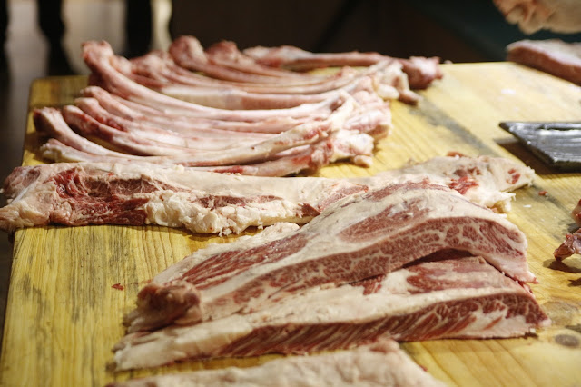 手起刀落不消多久就將整件牛五花部份分體解剖好