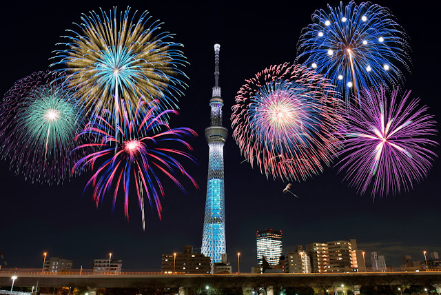 望著點燈的晴空塔,夜裡以隅田川為舞台,超過兩萬發五光十色的煙火照亮東京夜空!